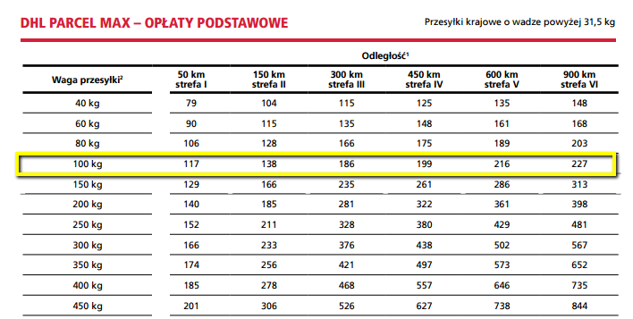200 x 50 x 40/4000 = 100 kg – wysyłka naszej paczki byłaby wyceniana zgodnie z większą wagą, w tym przypadku gabarytową. Dlatego cena będzie wyliczana wg cennika „DHL Parcel Max”.