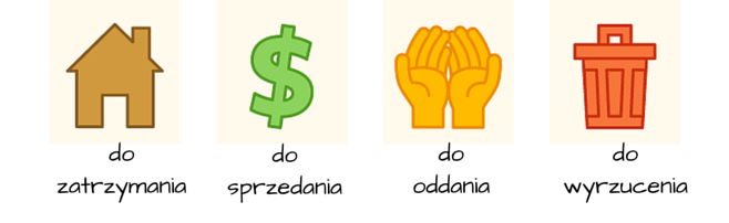 Czym się kierować podejmując decyzję? Czasami to proste. Pomyśl o tym, jak inni mogą postrzegać Twoją wystawkę maskotek z dzieciństwa. Ile razy użyłeś tego kufla od wujka Andrzeja? Często kryterium wyboru będzie ilość kurzu uzbierana na rzeczach. Jeśli jednak nie do końca wiemy, co zrobić ze swetrem, który zakładamy 4 razy w roku, warto skorzystać z poniższych wskazówek. Jeśli już wiesz, że niektóre z przedmiotów wylądują na aukcji w internecie – postaraj się sprzedać je jak najszybciej, nie czekaj do ostatniego dnia pobytu w poprzednich mieszkaniu. Pamiętaj – im mniej zbędnych drobiazgów, tym niższy koszt przeprowadzki.