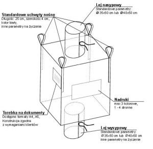 Większość producentów umożliwia również wykonanie na big bagach nadruków np. oznaczenia magazynowe lub logo firmowe. Czasem big bagi posiadają koszulki na dokumenty A4.