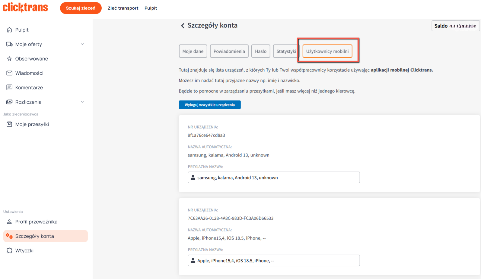 Z Aplikacji Clicktrans – dla Przewoźników może korzystać wspólnie kilka osób z jednej firmy. Każda z nich może używać swojego telefonu czy tabletu i z niego obsługiwać aplikację, m.in. przypisując do siebie przesyłki. W Aplikacji widać nazwy urządzeń, które używają Przewoźnicy, np. iPhone5 czy SamsungS8.