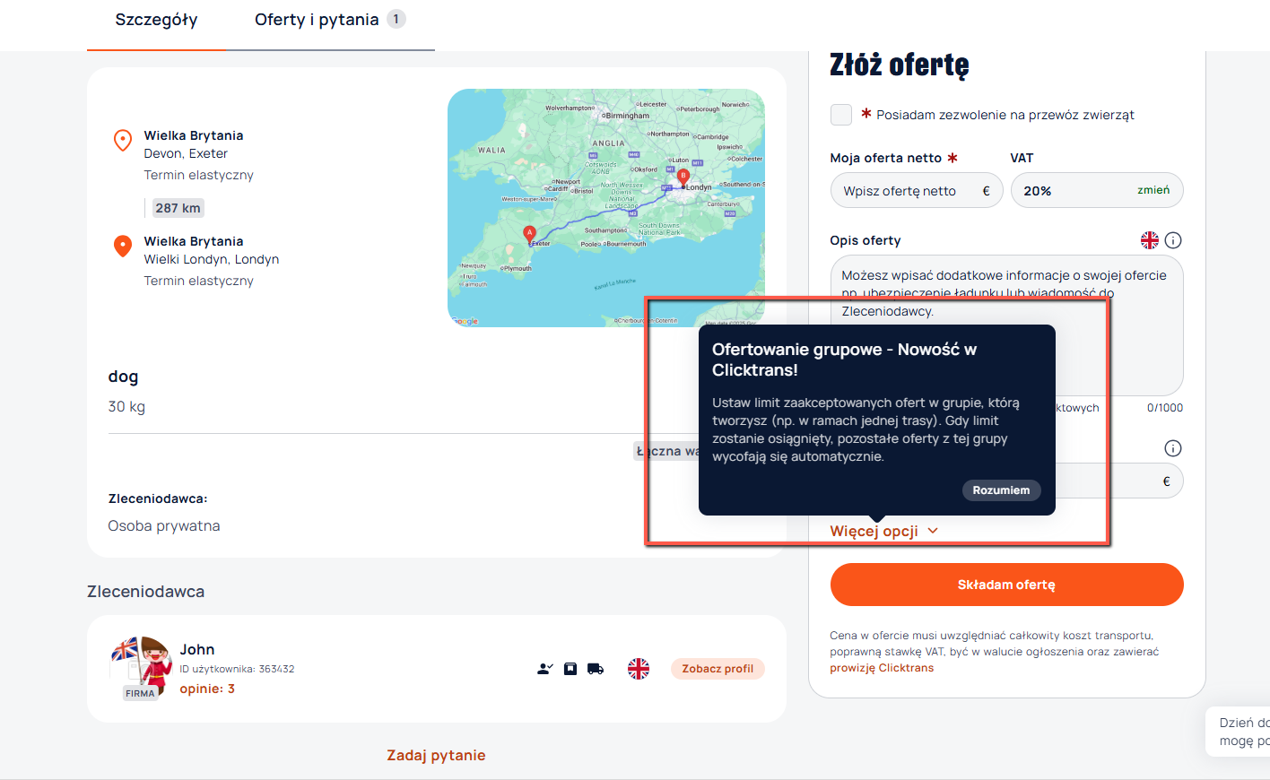 Ofertowanie grupowe pozwala łączyć złożone oferty w grupy z ustalonymi przez przewoźnika limitami zaakceptowanych ofert. Dzięki temu przewoźnik może złożyć np. 20 ofert mimo że jest w stanie zrealizować np. 5 z nich. Kiedy np. 5 ofert zostanie zaakceptowanych, reszta ofert jest automatycznie wycofana bez narażania przewoźnika na niepotrzebny stres i formalności wynikające z konieczności odwoływania transportu. Po osiągnięciu limitu grupa zostaje dezaktywowana.