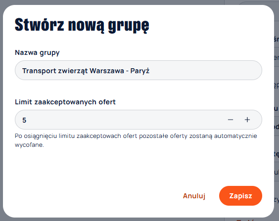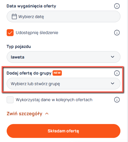 Grupy ofert możesz tworzyć i edytować bezpośrednio z formularza składania oferty na karcie przesyłki dowolnego zlecenia.