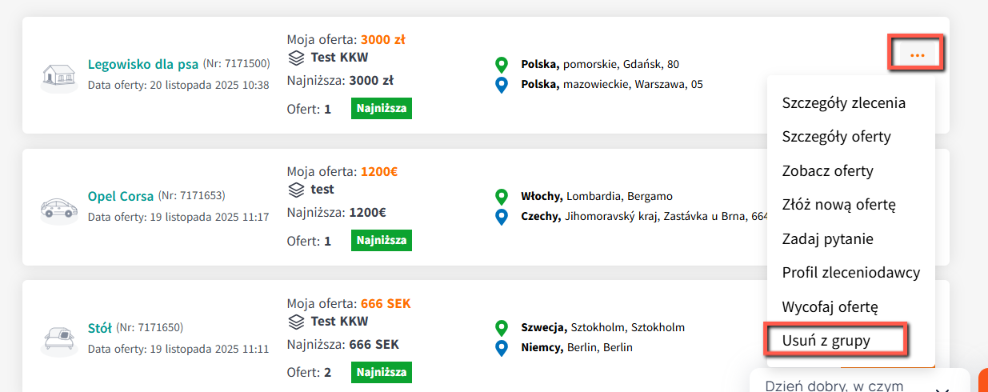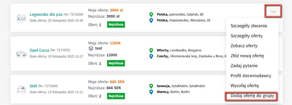 Możesz dodać ofertę do grupy z poziomu zakładki “Moje oferty” po tym jak zostanie już złożona. Aby to zrobić, wybierz trzykropkowe menu przy ofercie i kliknij “Dodaj ofertę do grupy”.