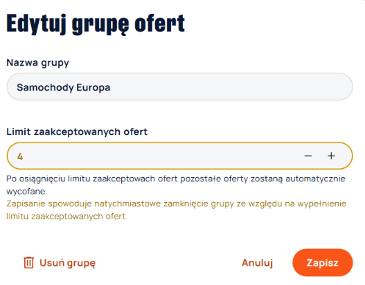 - Grupę można edytować zmieniając nazwę albo limit zaakceptowanych ofert