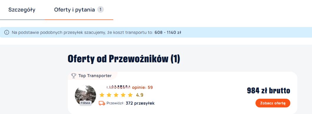 Na stronie swojego ogłoszenia możesz sprawdzić oferty transportu złożone przez Przewoźników. Znajdziesz je w sekcji "Oferty od Przewoźników":